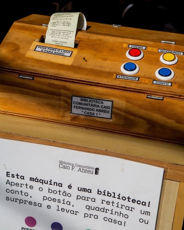 Uma biblioteca comunitária em São Paulo, criou uma máquina em que você imprime obras em notinhas. E você pode mandar pra eles. Pode ser conto, poesia, quadrinho ou atividade.