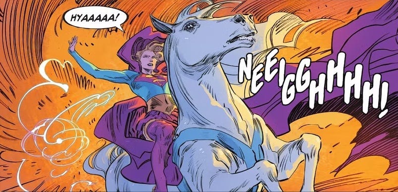 O novo filme da Supergirl estreia dia 6 de junho e eu estou super empolgado. Além de ser fã da personagem e do universo DC, também adoro o quadrinho específico na qual a história do filme se baseia, Supergirl: A Mulher do Amanhã. A obra já traz duas curiosidades interessantes. A primeira é que a arte foi feita por um casal de brasileiros, a desenhista Bilquis Evely, e o colorista Matheus Lopes. A segunda é que a Bilquis inseriu um easter egg bem nacional. Em uma cena num ônibus, vemos um casal de ETs de Varginha. Não sei se estes figurantes estarão no filme, mas minha principal indagação ao ver o trailer foi, “cadê o cavalo da Supergirl”? E sim, além do já querido e amado Krypto, o Super Cão, também existe um Super Cavalo. Em Supergirl: A Mulher do Amanhã, somos apresentados à Cometa, um lindo alazão com super poderes. Surgido em 1962, sua primeira versão era um centauro que foi transformado totalmente em cavalo. Já em A Mulher do Amanhã, sua origem é diferente e misteriosa, mas não vou contar porque te indico muito que leia o quadrinho, caso possa (eu li online pirata, alguém por favor me presenteia a versão física). Também existiu um super gato, mas ele não se tornou recorrente.