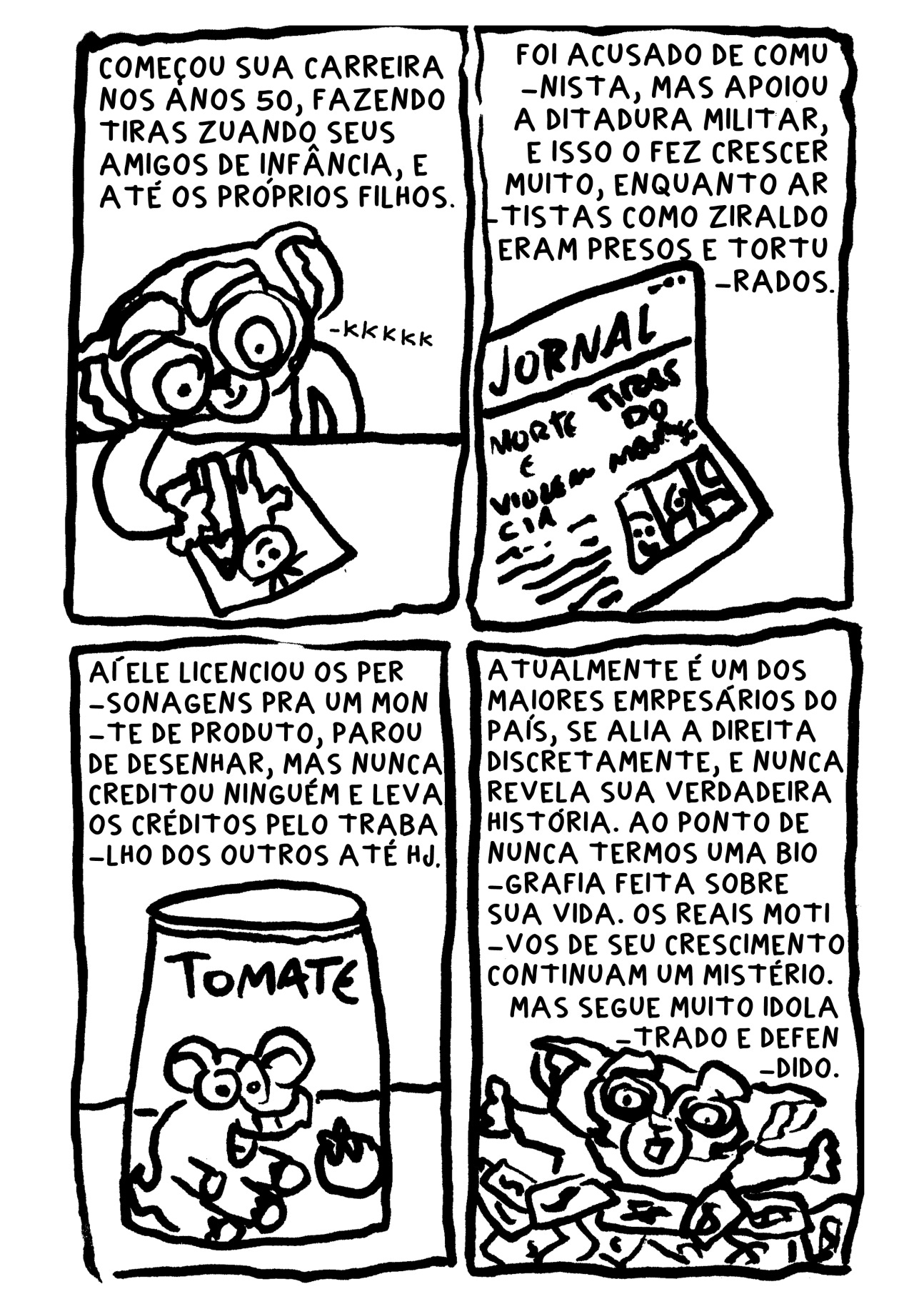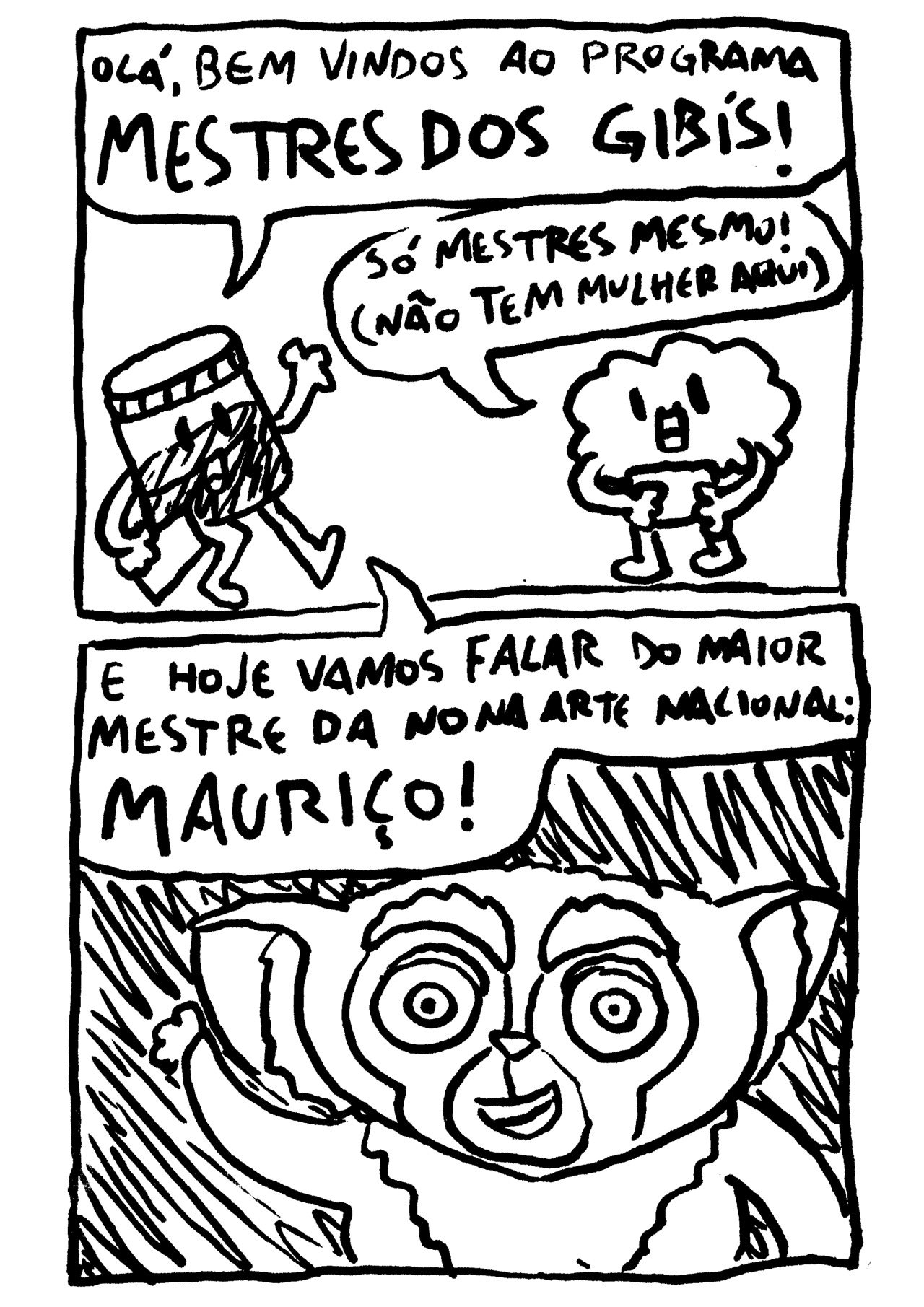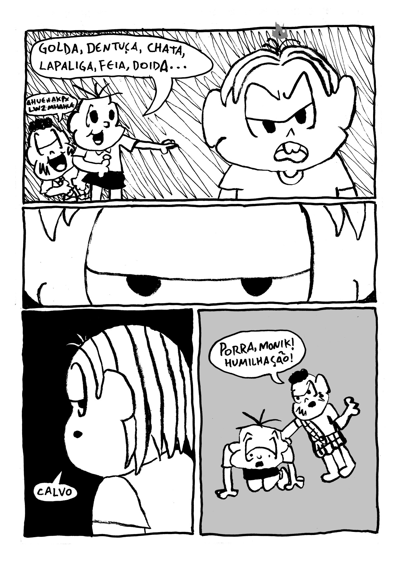 se de alguma forma isso é uma tentativa de mijar no trabalho do mauricio de souza, acaba saindo pela culatra como uma homenagem estranha. se for uma homenagem que quer existir no campo do desrespeito saudável e amigável, sai pela culatra como uma tentativa imatura de profanar o trabalho dele. em qualquer um dos ângulos, é necessário primeiro colocar o trabalho dele numa posição de importância. mauricio é um profundo conhecedor desse modelo. uma série de roteiristas majoritariamente não creditados já brilhou muito com 3 quadrinhos e os personagens da turma. você adota os personagens dele, você adota o formato dele, você reforça a unanimidade da presença dele no imaginário popular e a única inserção original são uns palavrões e pequenas ideias de como sujar o material. Nada é atingido.