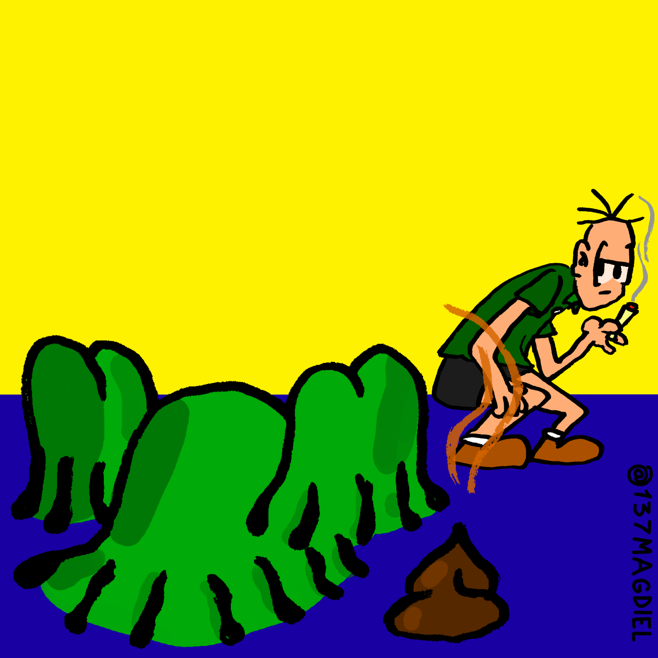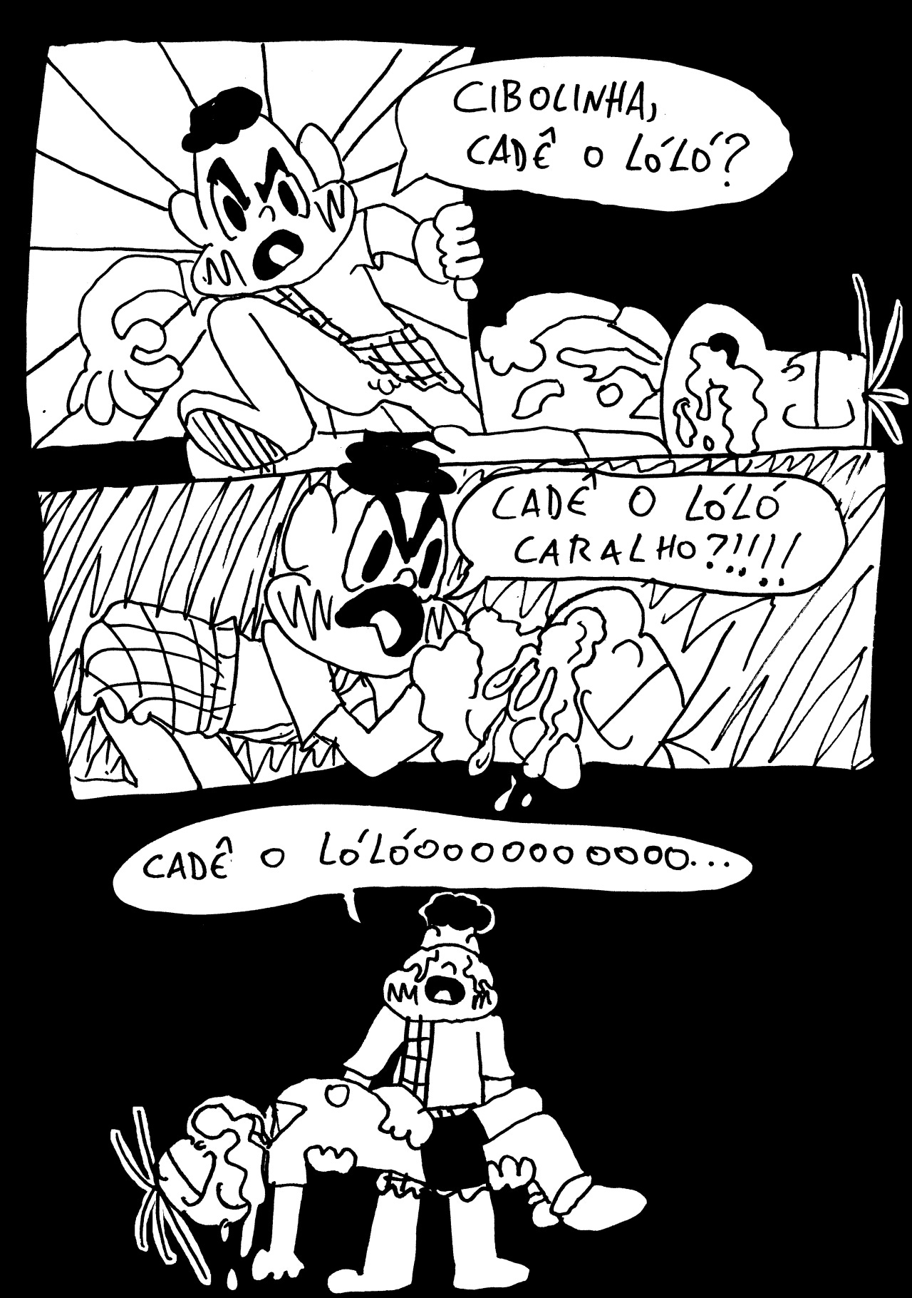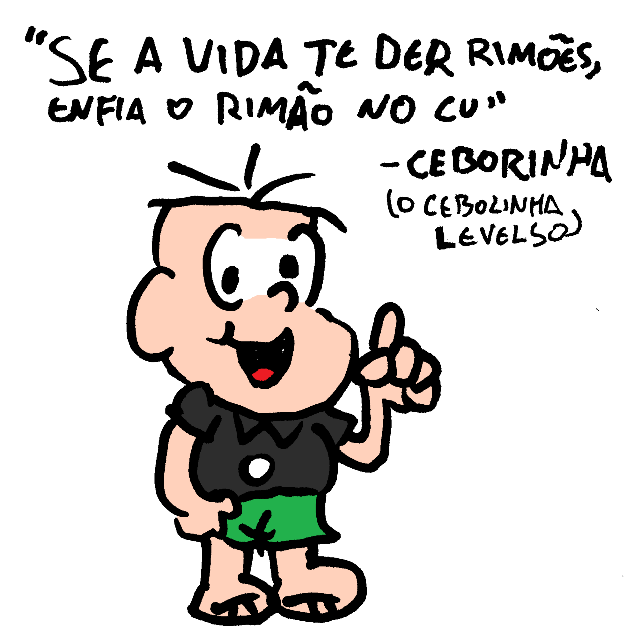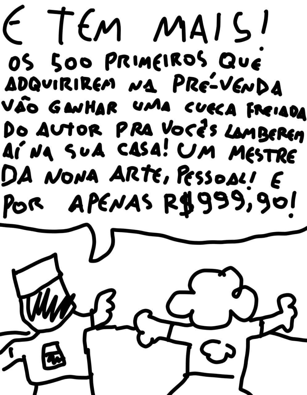 se de alguma forma isso é uma tentativa de mijar no trabalho do mauricio de souza, acaba saindo pela culatra como uma homenagem estranha. se for uma homenagem que quer existir no campo do desrespeito saudável e amigável, sai pela culatra como uma tentativa imatura de profanar o trabalho dele. em qualquer um dos ângulos, é necessário primeiro colocar o trabalho dele numa posição de importância. mauricio é um profundo conhecedor desse modelo. uma série de roteiristas majoritariamente não creditados já brilhou muito com 3 quadrinhos e os personagens da turma. você adota os personagens dele, você adota o formato dele, você reforça a unanimidade da presença dele no imaginário popular e a única inserção original são uns palavrões e pequenas ideias de como sujar o material. Nada é atingido.