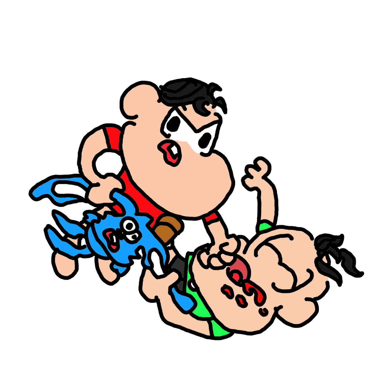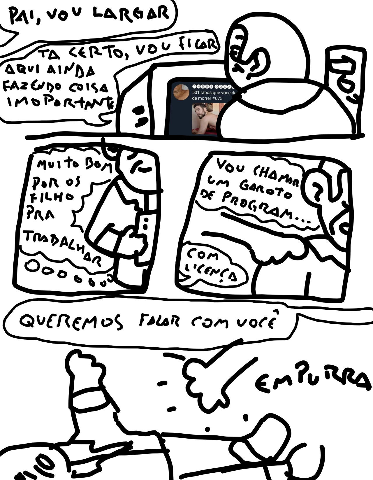 o tom escrachado unido aos desenhos *tronxos* desses personagens conhecidos, me informa que eu deveria estar rindo, e o conteúdo é… vago. esse texto não é *sobre* nenhuma dessas coisas porque nenhuma dessas coisas está no texto. a gente não sabe o que o gato quer com o vídeo. nós não podemos saber. o texto é só sobre esfregar o lúbrico contra o lúdico, duma forma vaga que indica a intenção de demonstrar a intenção de chocar sem jamais passar perto de chocar de verdade. são personagens de quadrinho infantil metendo e falando palavrão, mas eles tão desenhados dum jeito totalmente inofensivo, talvez mais inofensivo do que o próprio texto original (turma da mônica). A pica do cachorro está implícita, ele quer que você sinta a intenção dele de te chocar com a ideia da pica do cachorro, mas ele também quer que você simultâneamente saiba que ele não desenharia a pica do cachorro, pulsando, esporrando. não é sobre isso. não é pra te chocar de verdade. você também não quer isso. não estamos produzindo r34 dos animais da turma da mônica aqui. é por isso que a aparência precisa ser tão inofensiva e o texto precisa ser tão vago. e isso gera um resultado que simplesmente não funciona.