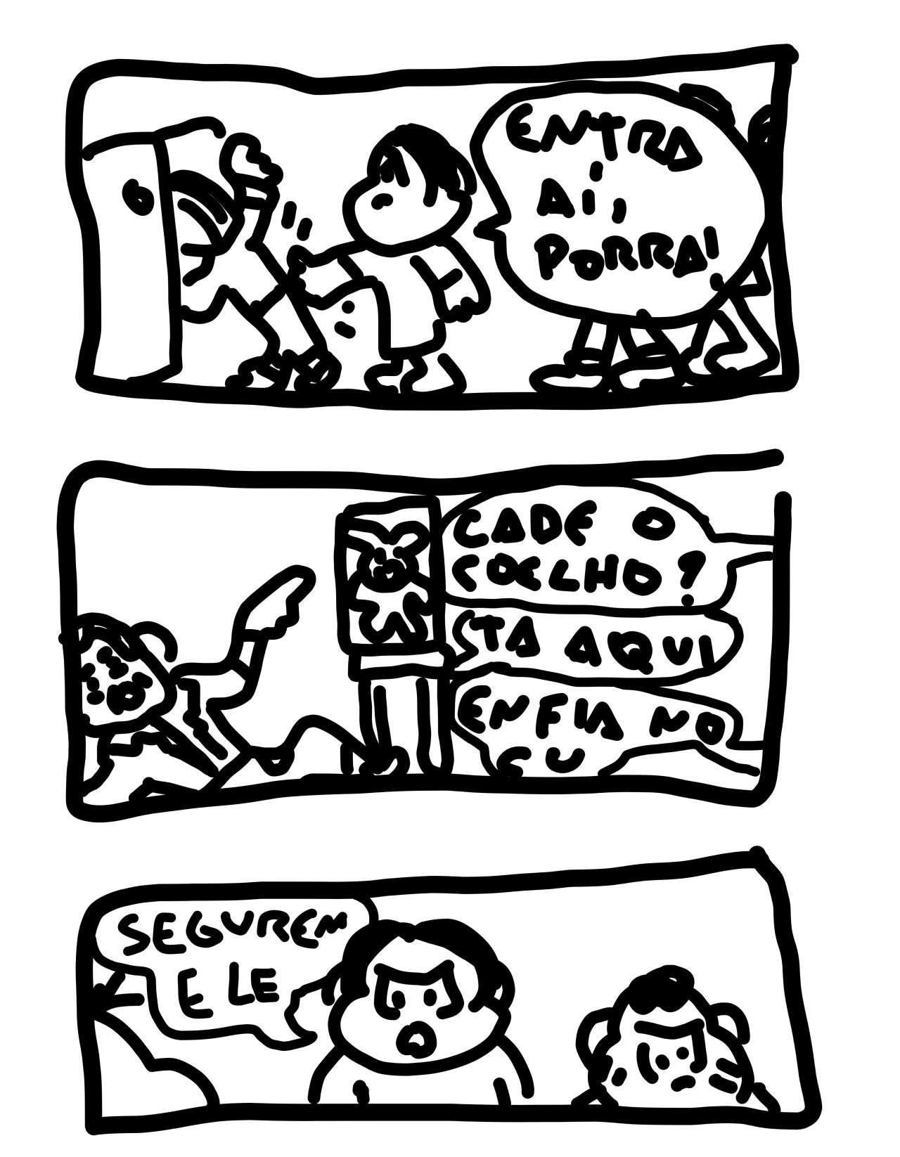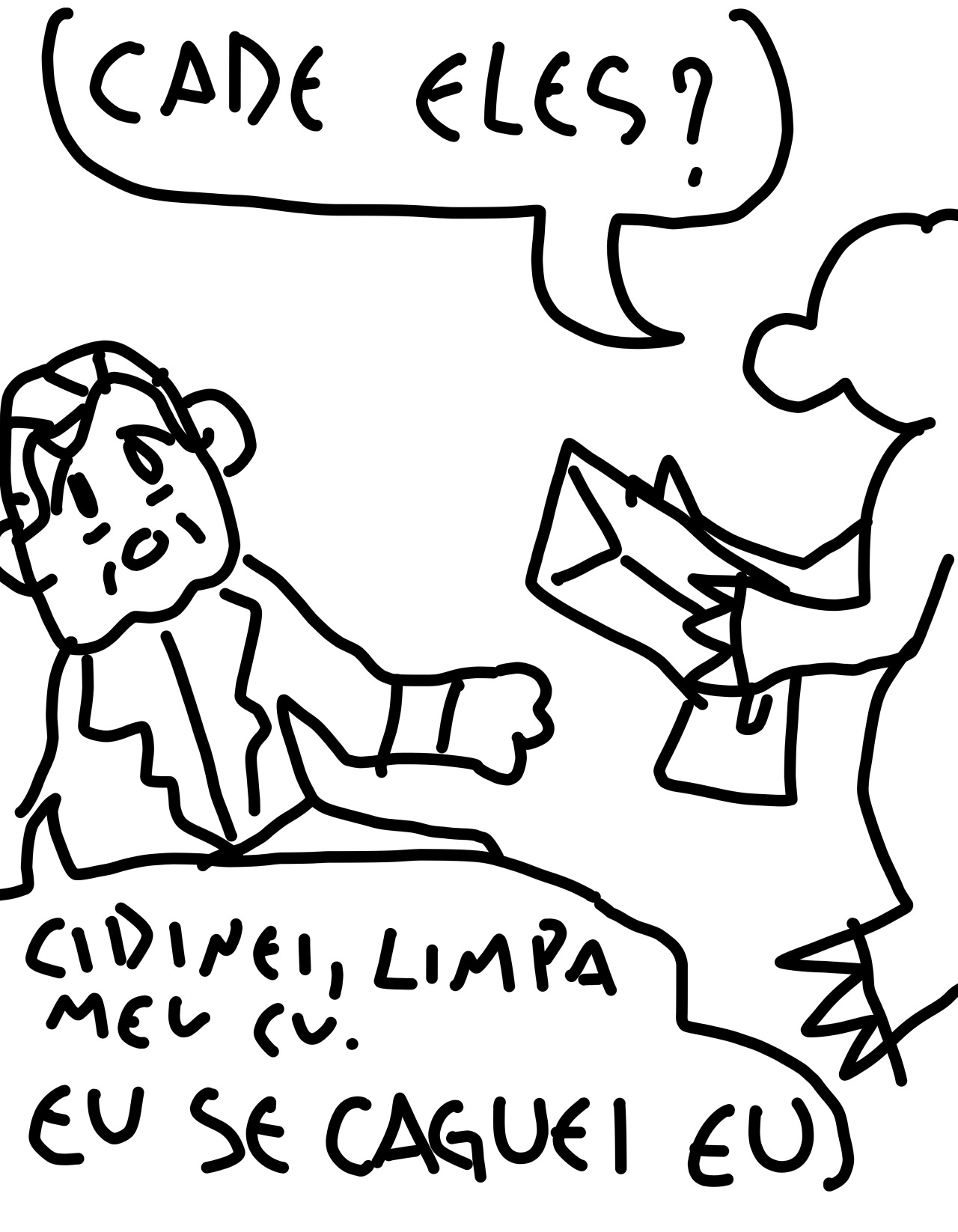 o tempo todo aqui eu vou partir do pressuposto que apesar de estar disfarçada de “tosqueira gratuita” ela está sim tentando concatenar ideias duma forma que faça sentido. dito isso, eu não acho que nenhuma das pessoas que curtiu e compartilhou conseguiria chegar numa resposta definitiva pra simples pergunta "qual o humor da tira?”.