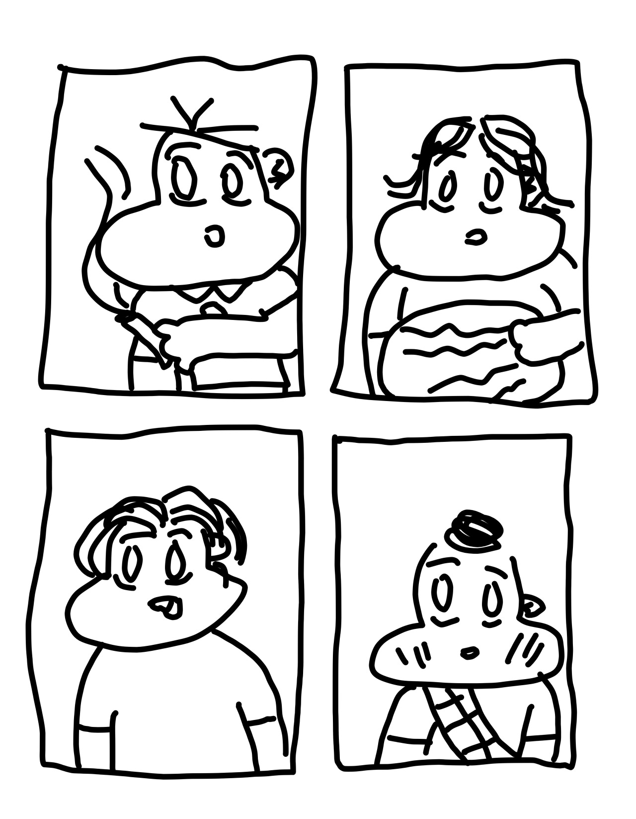 agora é mais tarde, vamos falar mais sobre serem personagens de história de criança em situações de despudoramento. o que é proposto como “absurdo”, no trabalho todo, incluindo a primeira tirinha, é a estranheza da justaposição entre os personagens fofos e a natureza impudica da ideia, e sim, isso tem valor cômico. Na verdade, isso é uma das coisas que me informa como leitor que eu deveria estar achando isso engraçado, mas apesar de ter um valor cômico, o valor não é explorado de nenhuma forma significativa. são duas estéticas opostas sendo atiradas uma contra a outra com força moderada. não chega nem a ser explosivo.