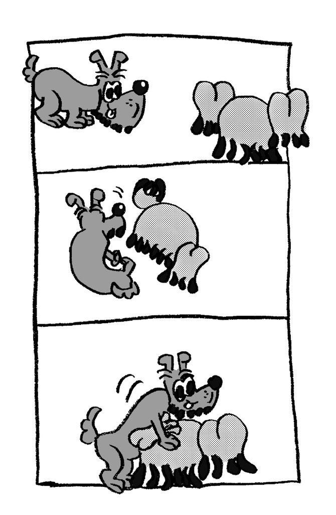 começa com o mingau achando absurdo eles transarem na rua, eles deveriam ter ido pelo menos prum telhado. >ISSO É UMA PUNCHLINE< ele fez uma piada aqui, isso é uma piada, você espera que o gato vá sugerir que eles não deveriam ter feito sexo em público, mas ele sugere outro local público. não é uma piada muito boa, mas é uma piada.... e além disso eu consigo reconhecer o valor cômico visual dos cachorros presos pela pica, que também não é muito, mas está ali. uma oportunidade incrível de parar aí e ter uma continuação pra sua tirinha. pronto! mas ele continua, por mais DOIS quadros. arte sequencial.