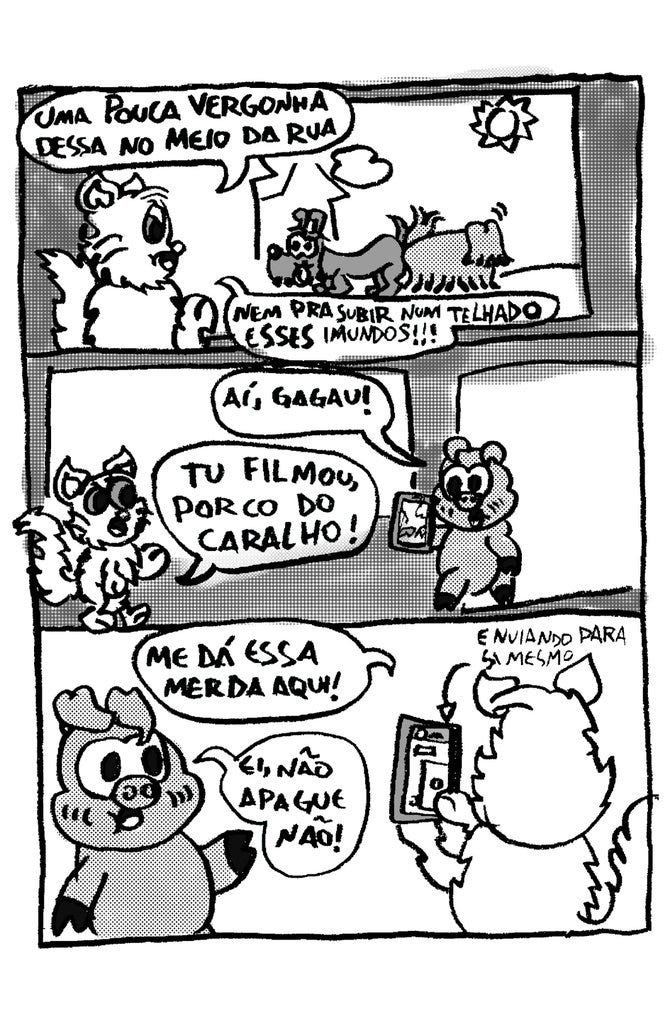 e com a resposta do gato “tu filmou, porco do caralho!” eu acho que é hora da gente começar a tentar entender quais exatamente são essas estéticas que estão sendo jogadas uma contra a outra aqui. esse texto é *sobre* o quê? quais são seus temas centrais, sinceramente? isso é uma tirinha sobre revenge porn de cachorro homossexual? ou isso é uma tirinha sobre homofobia internalizada de gato conservador? eu tô maluco? lidando só com a informação que me foi dada aqui eu sei que o gato tá insatisfeito. ele desaprova o sexo, ou pelo menos a forma como o sexo foi conduzido. ele desaprova a filmagem, ou pelo a forma como a filmagem foi conduzida. ele também quer o vídeo por algum razão implicitamente perversa, uma pequena quebra de expectativa, mas sustenta uma piada? mais sobre isso mais tarde, de novo.