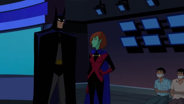 Ela ainda não é membra efetiva da Liga da Justiça e está sendo treinada pelo Batman. A interação dos dois é muito boa. Diferente de qualquer Robin, a marciana não se vê abaixo dele, mesmo estando em treinamento, e ele a vendo como subordinada, ela o vê como igual. Achei bem legal a forma como ela não se sobrepõe, não se deixa intimidar (como muito personagem se intimida perto do Batman), responde de forma direta e põe o Batman no lugar dele, tudo isso de forma amigável e sem nenhum pingo de arrogância.