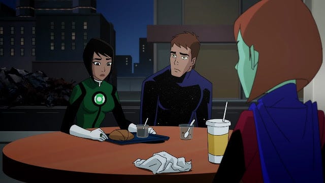 Pois bem, a vinda dos três vilões ao presente é o que une nossos dois protagonistas. Enquanto cada um não sabe como lidar com seus problemas, e os demais colegas também não sabem como ajudar, Jessica e Astron encontram um no outro a ajuda que precisavam. Por passarem por coisas similares, embora diferentes, ambos conseguem entender o que o outro passa, e dar suporte. Essa amizade mostra que, mesmo se você for um super herói, sozinho a gente não consegue lidar com todos os problemas. principalmente se o quadro for clínico. Muitas vezes a gente acha que consegue resolver sem ninguém, mas isso só adia uma piora. Não se acanhe em procurar ajuda. Jessica e os Lanternas Verdes estão aí pra nos ensinar que força de vontade também é um super poder.