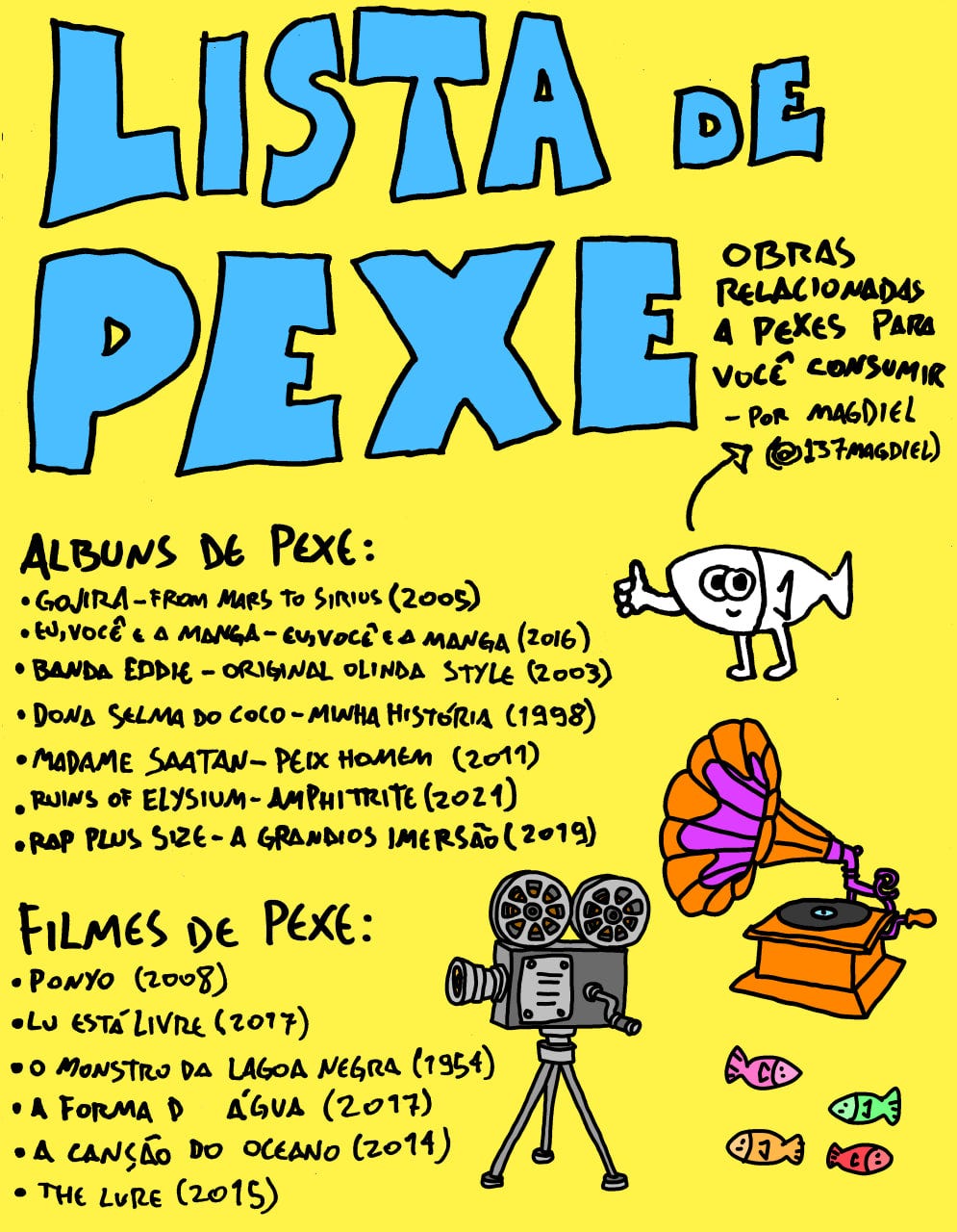Você pode ter se perguntado: “Cadê Fagner”, “cadê Procurando Nemo”. Eu amo Procurando Nemo e mais ainda Procurando Dori. Gosto muito do filme Luca, e Borbulhas de Amor é minha música favorita. Porém existem muitos filmes e discos de pexe e eu tinha um espaço limitado, o que me fez tirar coisas obvias que a maioria já conhece.