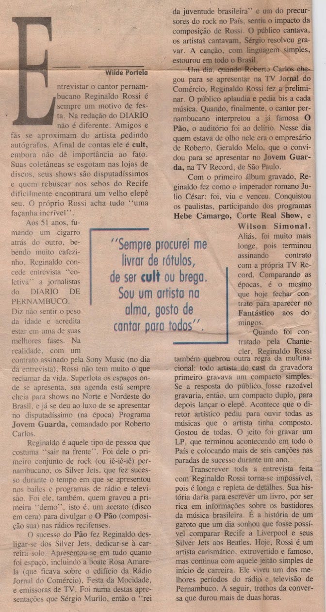 A matéria é do Diário de Pernambuco. Se trata de uma entrevista concedida em 1995, quando o rei tinha apenas 51 anos de idade, e 30 anos de carreira, ao repórter Wilde Portela, na sessão Viver. Wilde, conhecido no mundo dos quadrinhos por ser roteirista, já abriu shows de Reginaldo Rossi nos anos 60, com sua banda Beatles Boys, e escreveu um livro sobre ele em 1999.