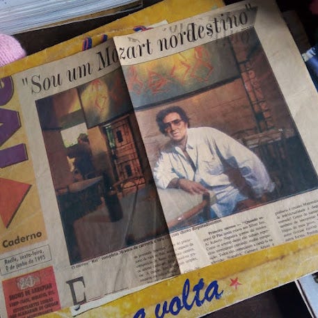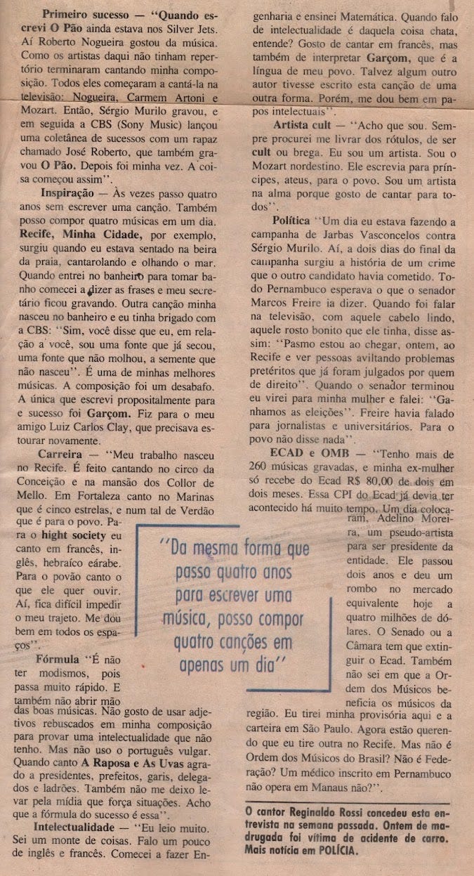 Para minha surpresa, dentro da capa junto ao disco, como se fosse um encarte, estava uma folha de jornal com uma foto do Reginaldo e os dizeres "Sou um Mozart nordestino".